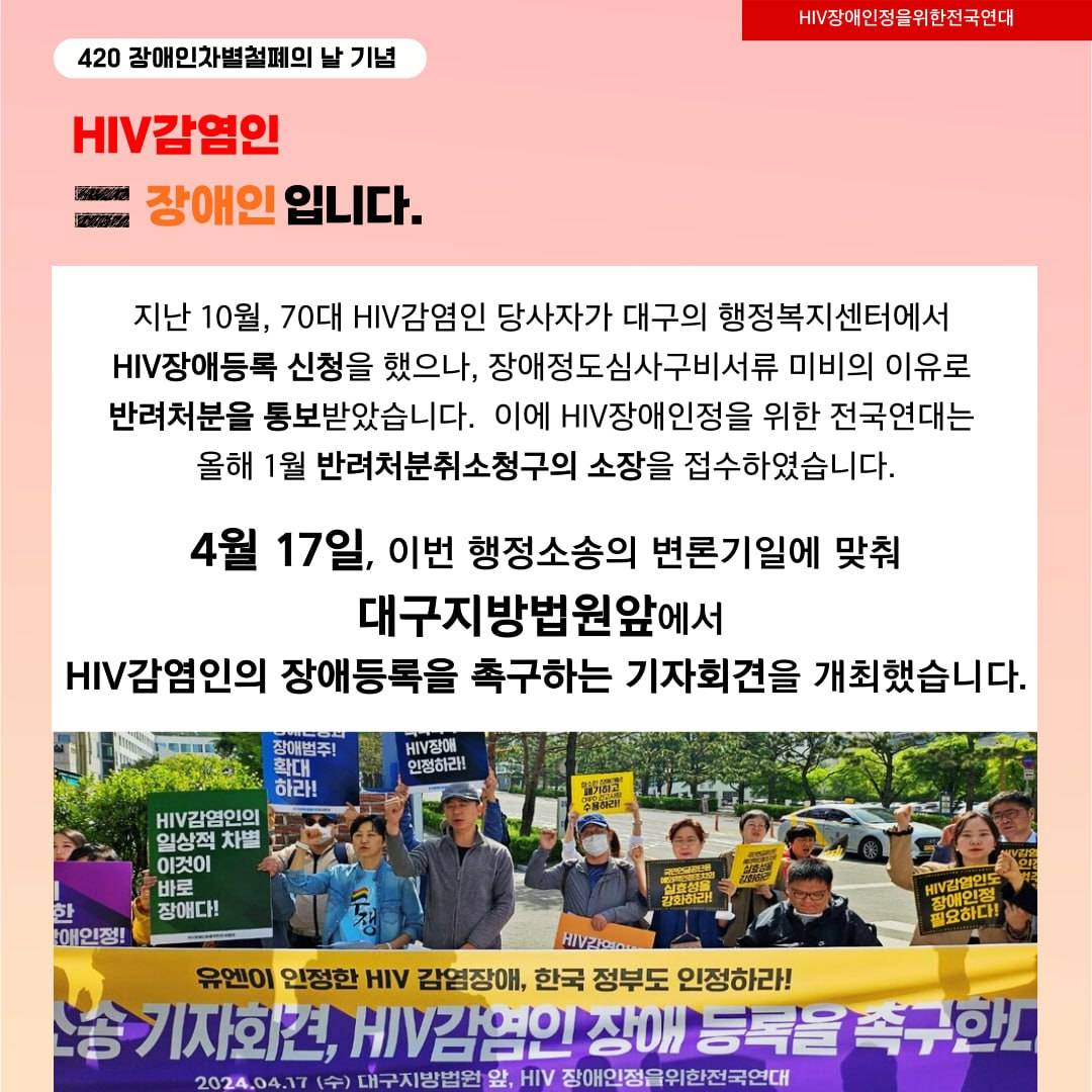 이번 HIV 장애 인정 소송은 사회에 만연한 모든 차별에 균열을 내는 일입니다. 소송의 당사자는 “내 살아생전 HIV 장애 인정이 되지 않더라도, 남아있는 PL동료들과 지금도 투쟁 중인 장애 동지들의 삶에 함께 연대하는 것으로 내 남은 삶을 살아내겠다.”는 이야기를 통해 사회의 차별에 대해 맞서겠다는 의지를 내보였습니다. 소수자들을 향한 사회적 차별은 같은 대구 지역만 하더라도 어렵지 않게 찾아볼 수 있습니다. 대구 북구에 건립하려던 ‘다룰이만경북이슬라믹센터(이슬람사원)’는 대구북구청의 명분 없는 공사 중지 행정처분 이후 대구지방법원과 고등법원의 행정처분 취소 명령에도 불구하고 일부 주민의 방해와 폭력으로 아직까지 공사를 진행하지 못하고 있는 상황입니다. 그리고 대구퀴어문화축제의 경우, 적법하게 신고된 집회임에도 불구하고 대구시에서는 이를 불법집회로 규정하고 허위사실을 유포, 공권력을 동원하여 축제 진행을 방해하는 등의 차별적 행태를 보였습니다. 이번 소송은 HIV 감염인을 장애인으로 인정하고 그들을 향한 차별이 장애인차별금지법상 차별로 적용이 되는 것을 넘어, 차별받고 소외되는 사회의 모든 소수자들의 드러나지 못했던 목소리가 지역 사회에 드러나는 계기가 될 것입니다. 이 모두의 권리가 보장되는 날까지 우리는 지속적으로 연대할 것입니다.