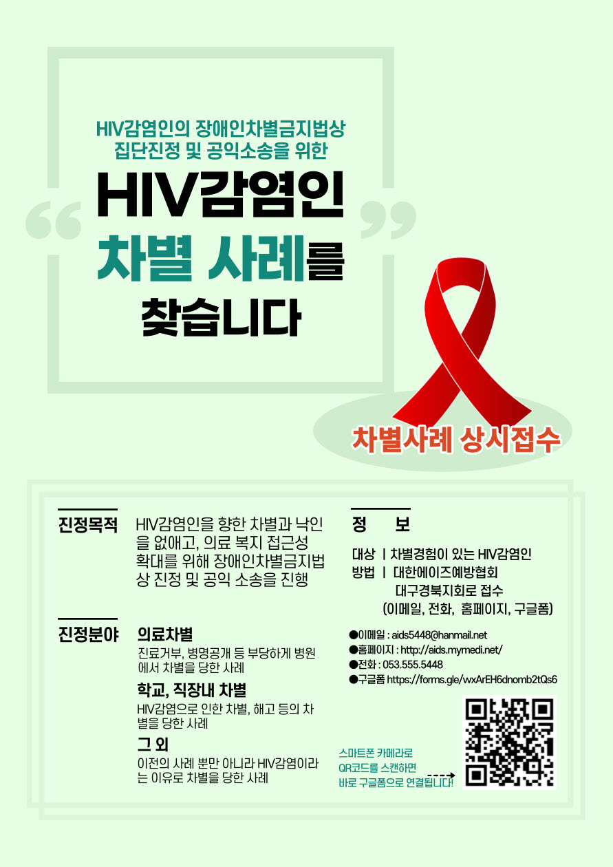 HIV감염인의 장애인차별금지법상 집단 진정과 공익소송을 위한 HIV감염인의 차별사례를 찾고 있습니다.