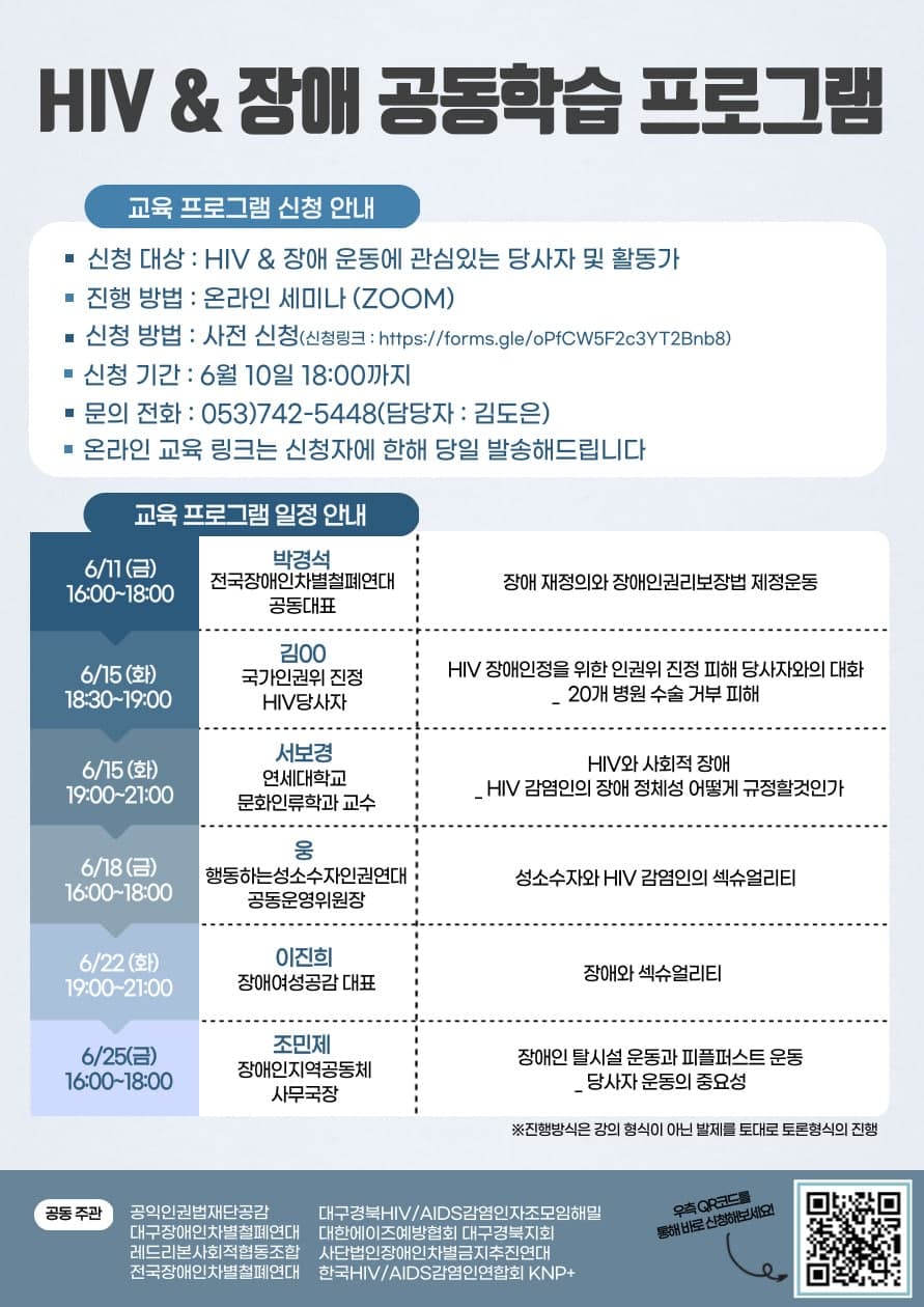 HIV 장애인정을 위한 이해도를 높이기 위해 공동학습 프로그램을 기획했습니다.