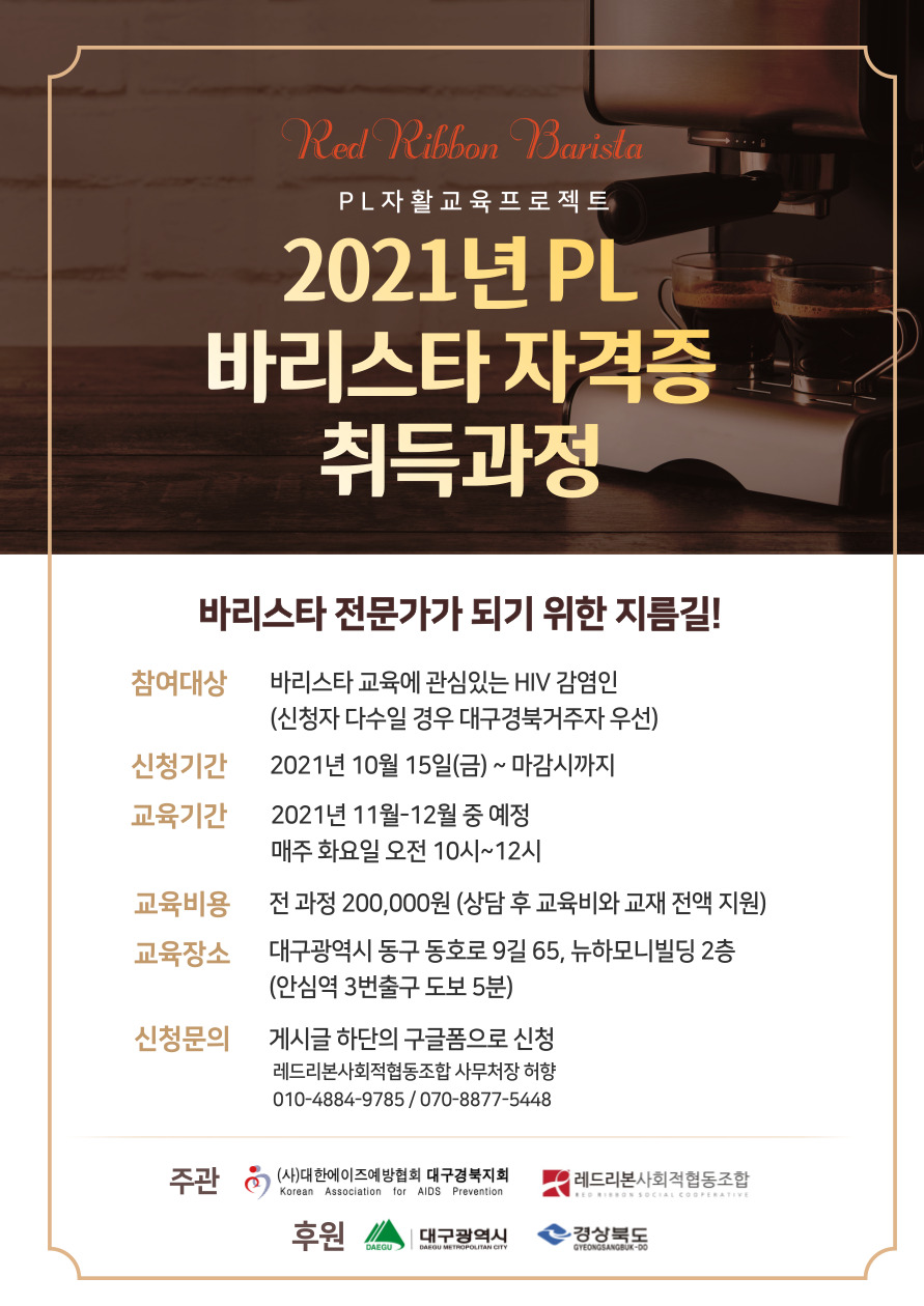 2021년 PL자활교육훈련 바리스타 자격증 취득과정을 안내드립니다.