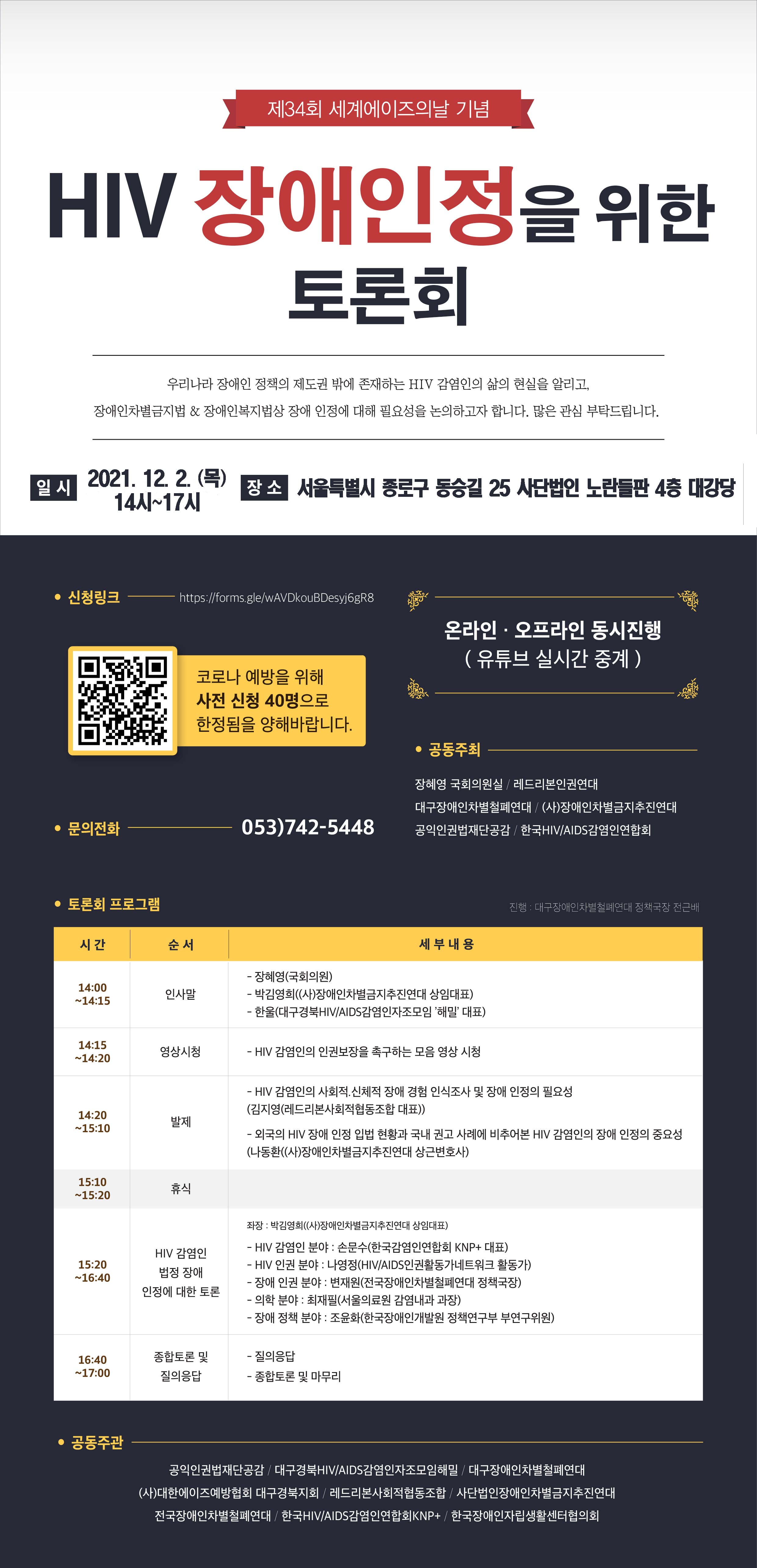 우리나라 장애인 정책의 제도권 밖에 있는 HIV감염인의 삶을 알리고 장애인차별금지법과 장애인복지법상 장애인정에 대해 논의하는 토론회를 진행합니다! 온라인(유투브 실시간 중계)과 오프라인이 동시 진행되오니 많은 관심 부탁드립니다!