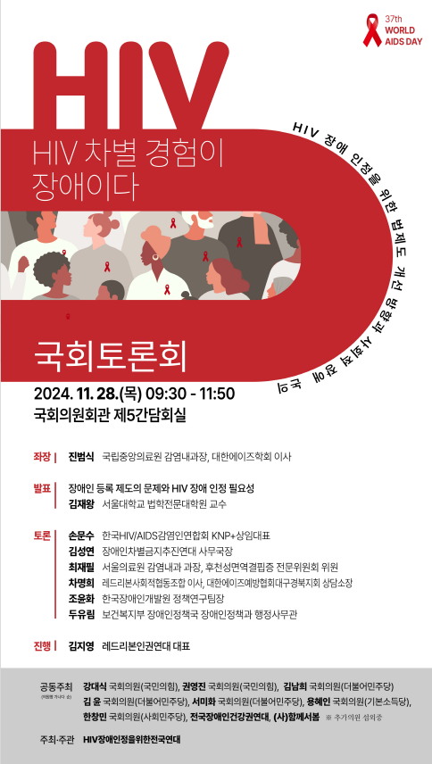 제37회 세계에이즈의 날을 기념하여 장애인 정책의 제도권 밖에 존재하는 HIV 감염인의 다중적이고 교차적인 차별의 경험을 알리고, HIV 감염의 장애 인정을 위한 법제도 개선 방향과 사회적장애를 논의하고자
