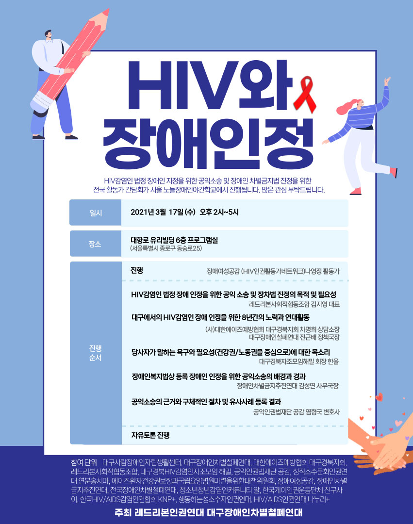 HIV감염인 법정장애인등록을 위한 전국활동가 간담회를 2021년 3월 17일 서울장애인노들야간학교에서 개최됩니다. 많은 관심 부탁드립니다.